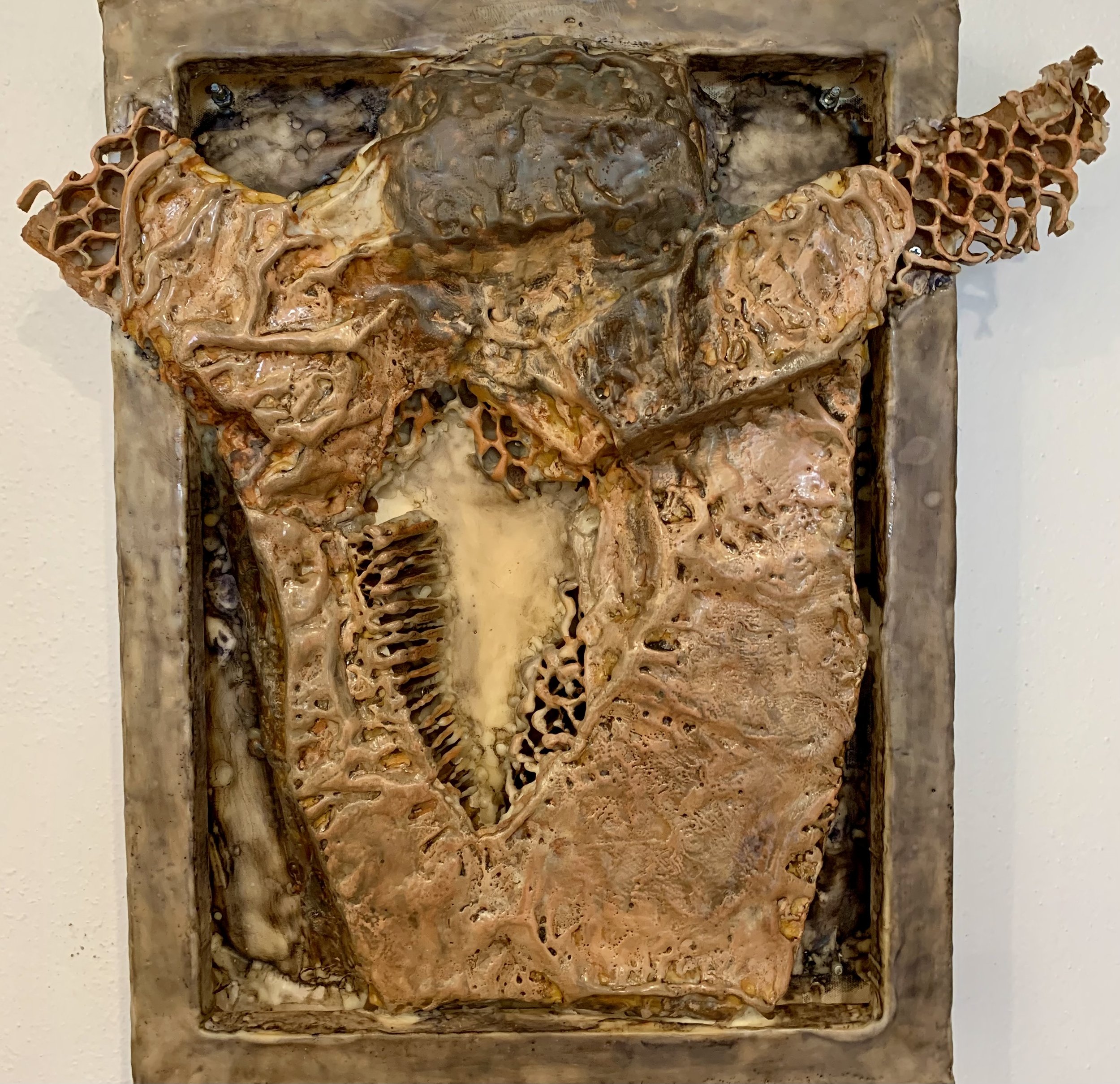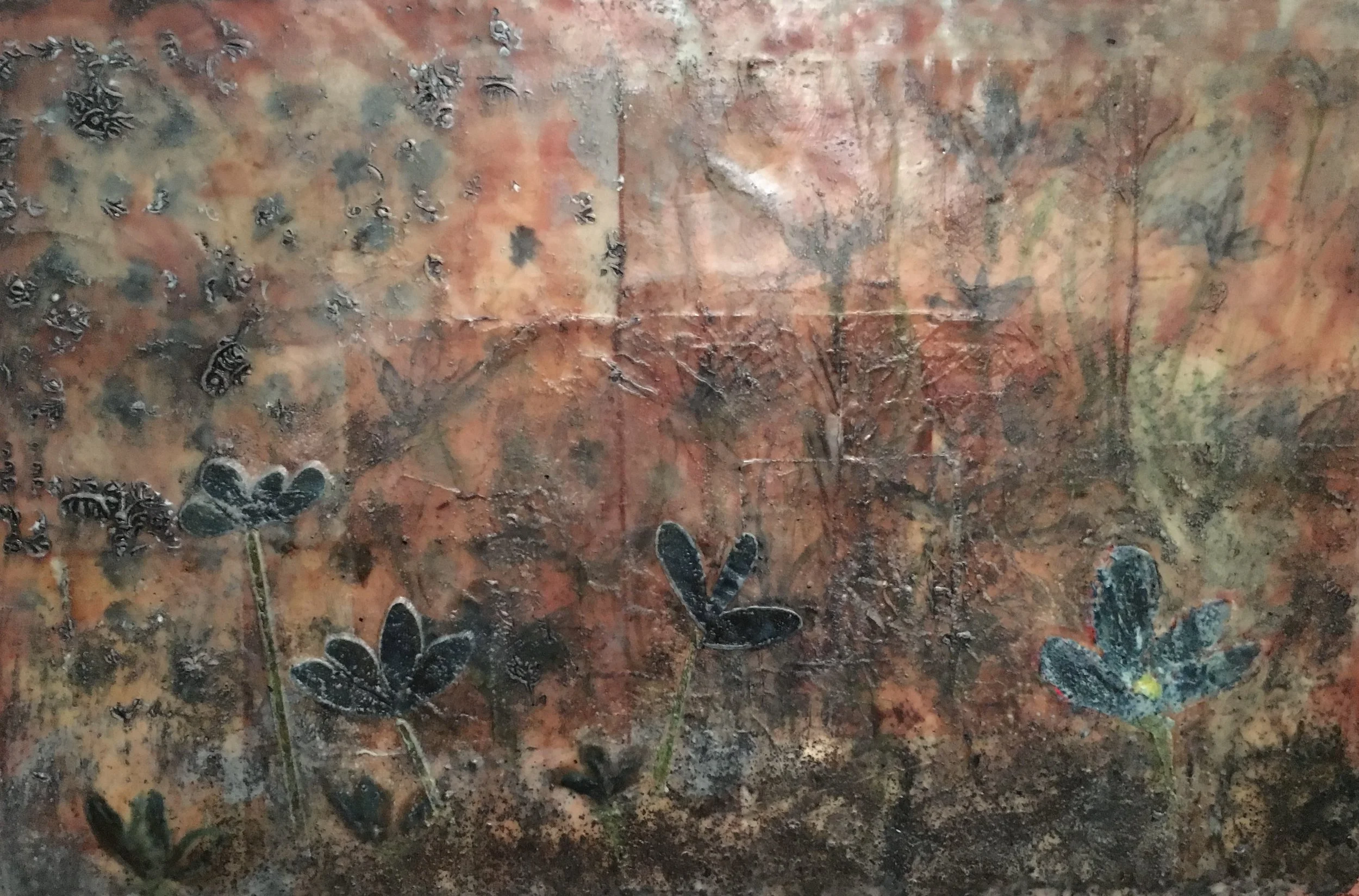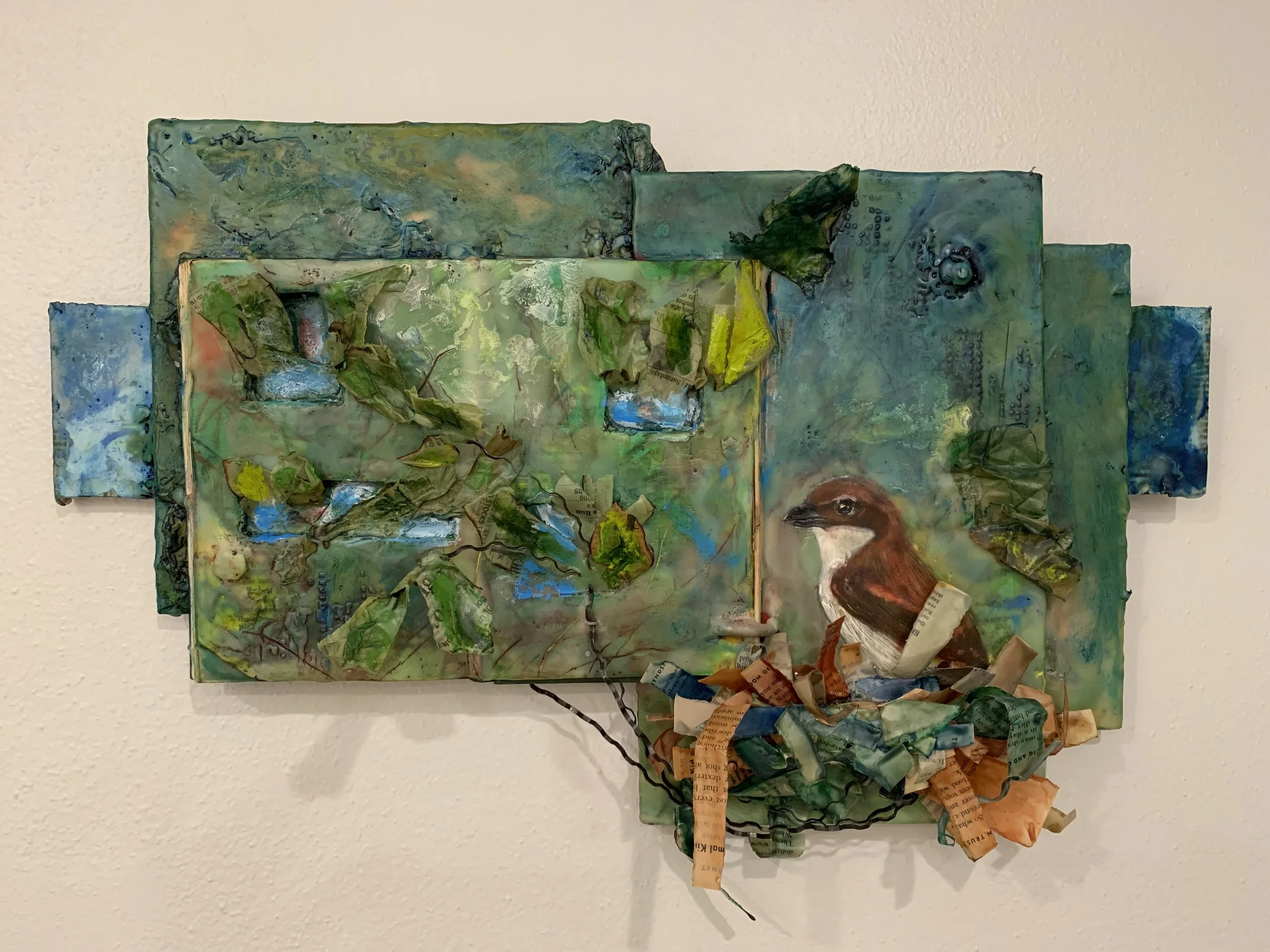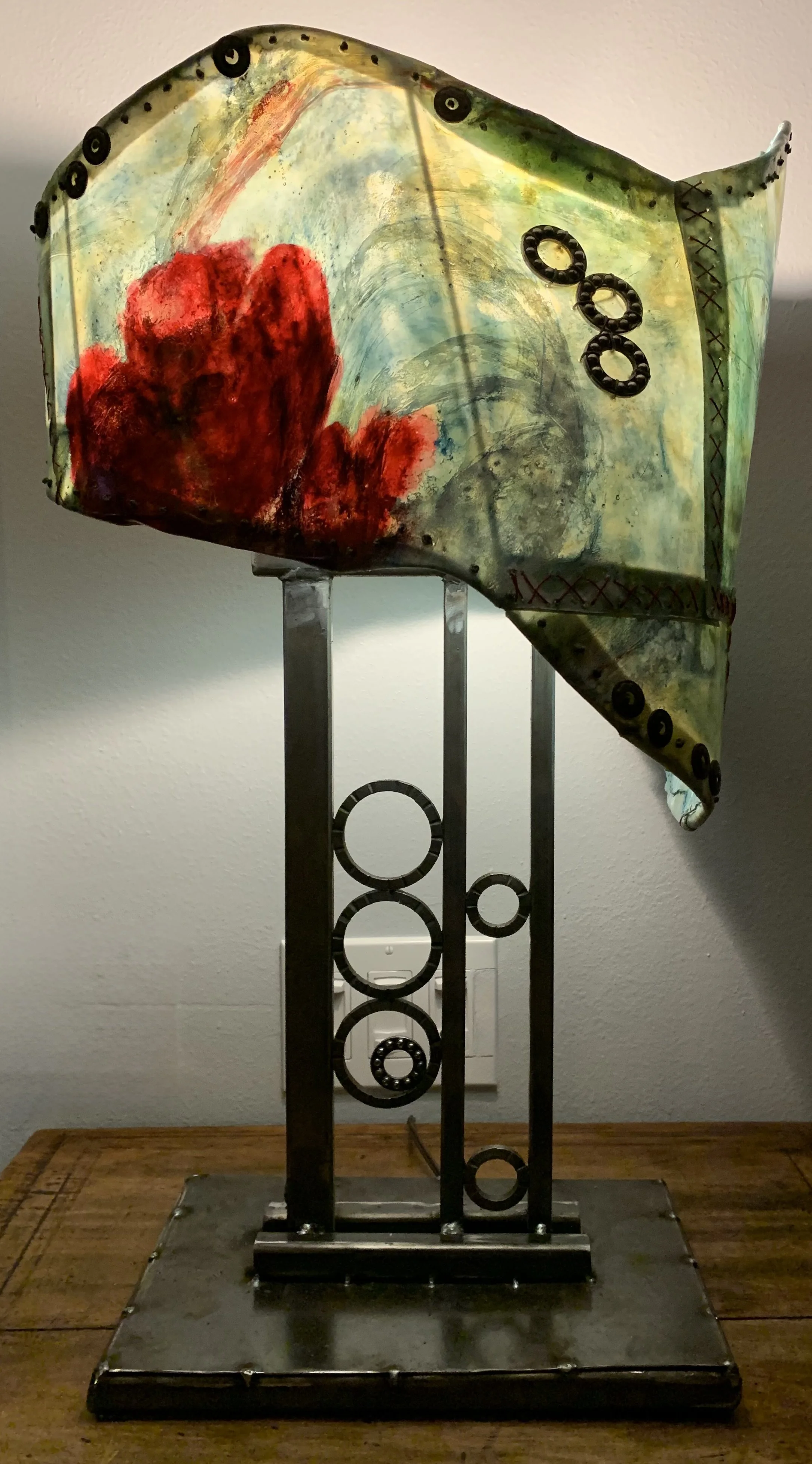 I created this lamp during a Beginning Welding class with Sal St. Germain at the Morean Arts Center in St. Petersburg FL. The base is welded steel and aluminum and the lampshade is encaustic mixed media.
