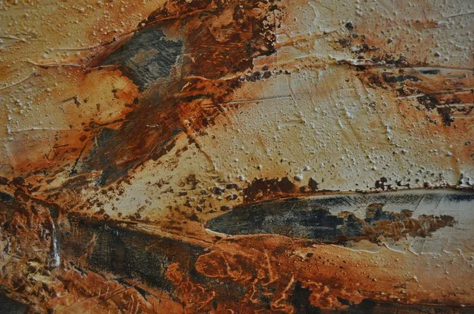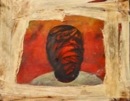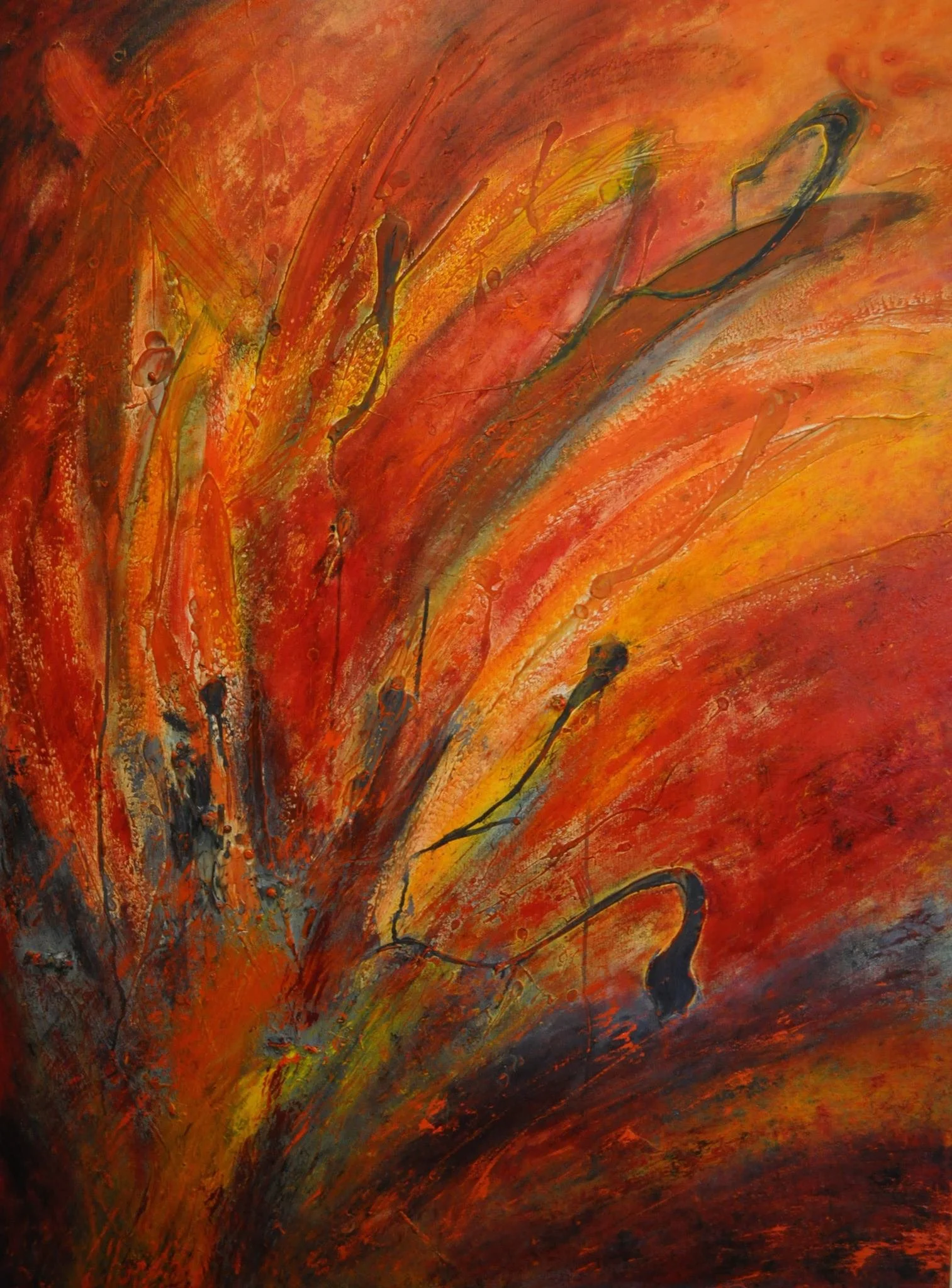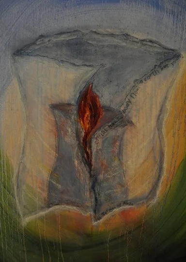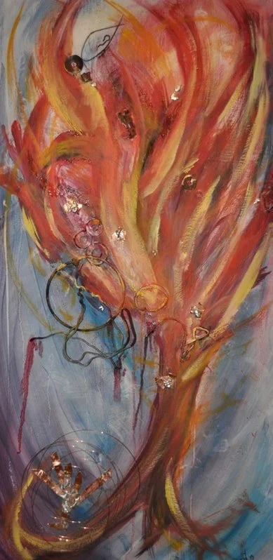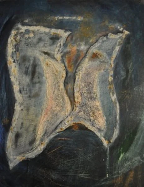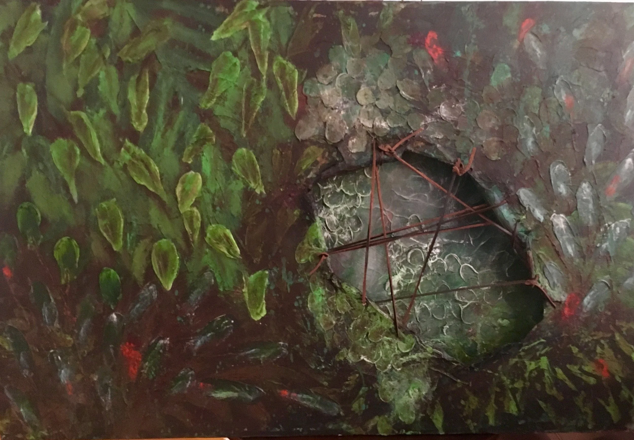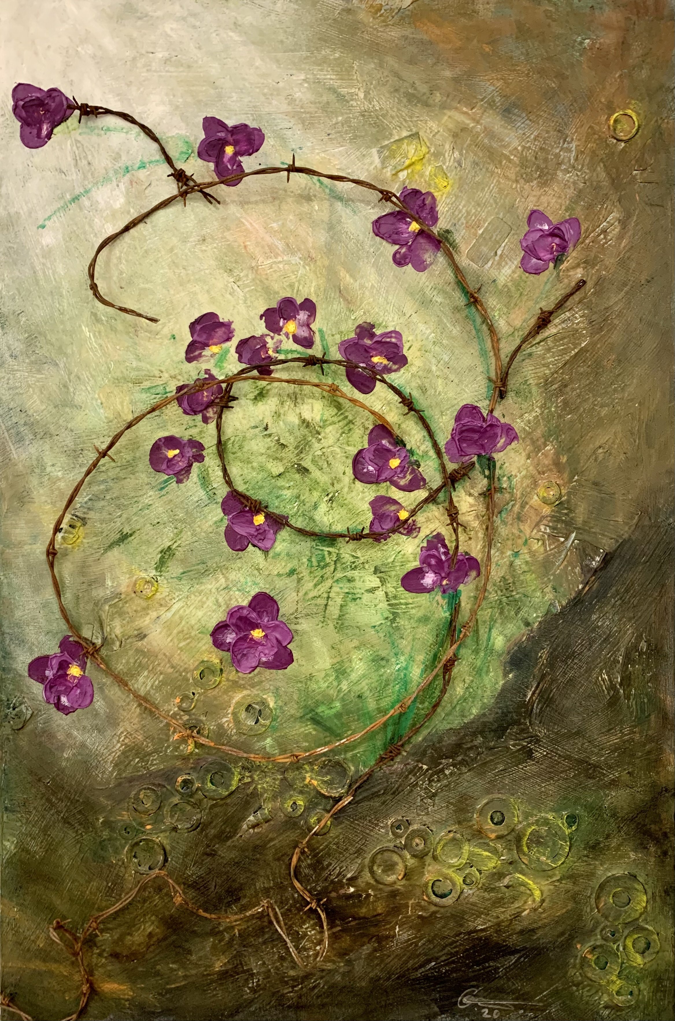 I created this lamp during a Beginning Welding class with Sal St. Germain at the Morean Arts Center in St. Petersburg FL. The base is welded steel and aluminum and the lampshade is encaustic mixed media.