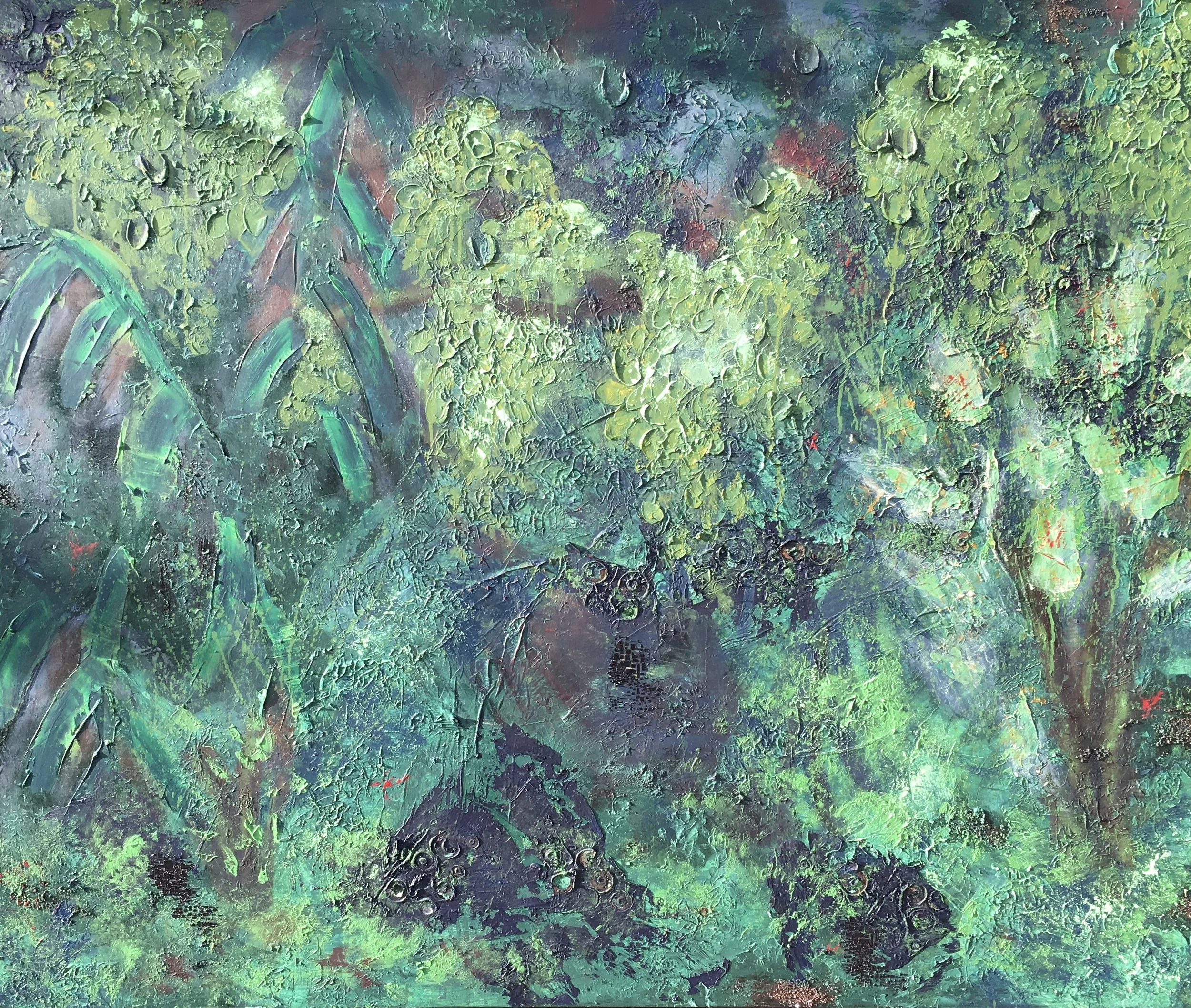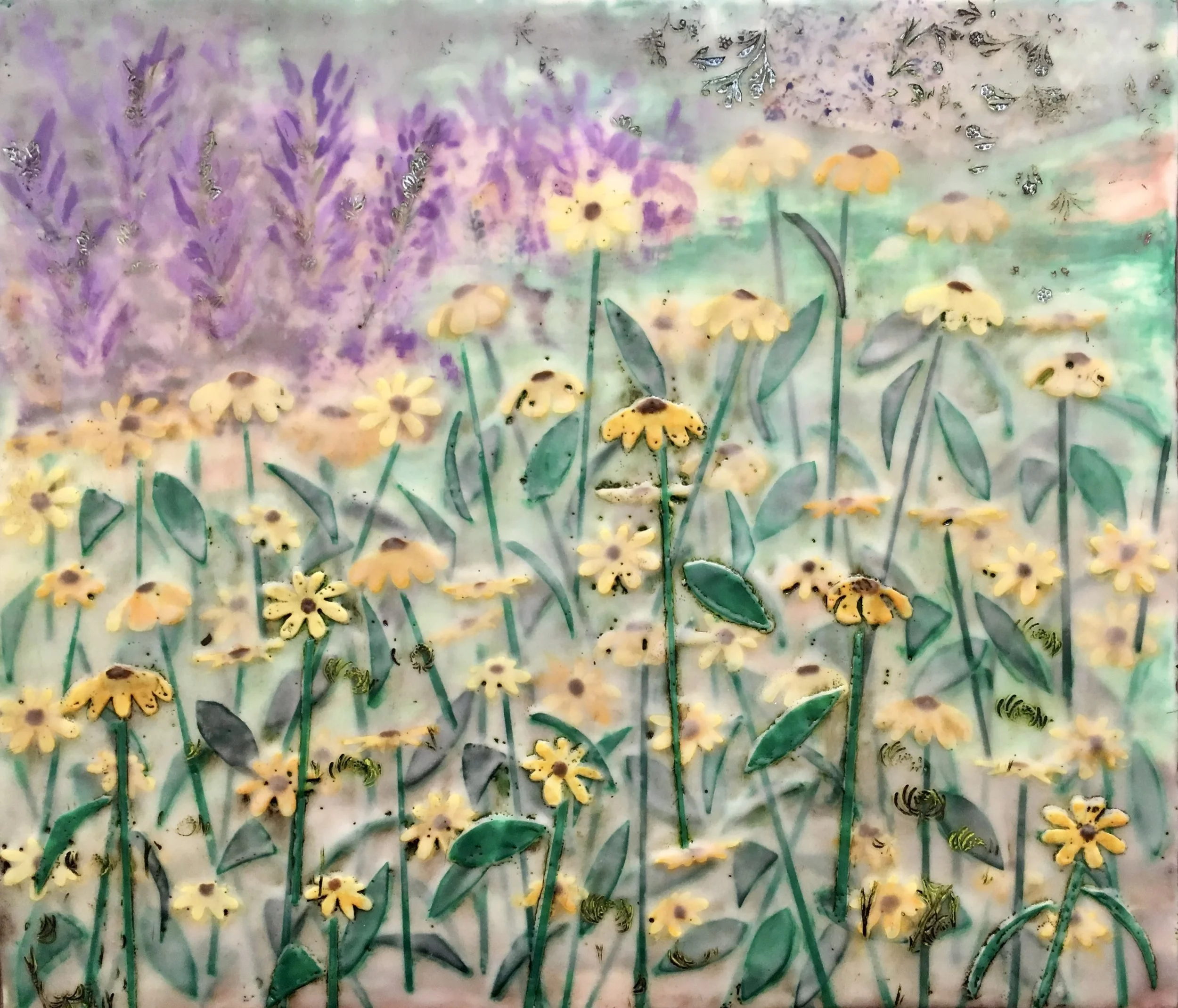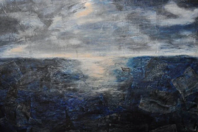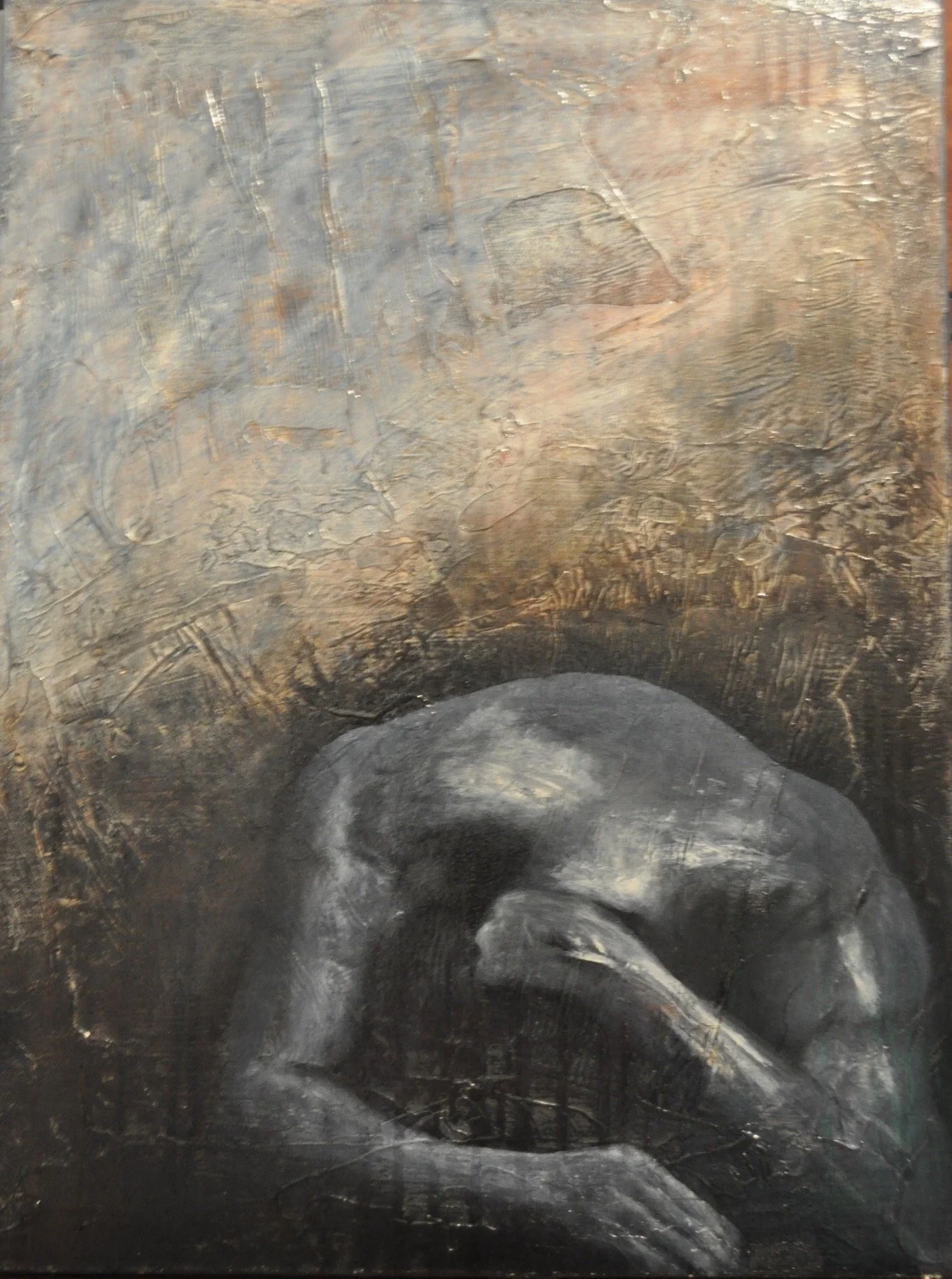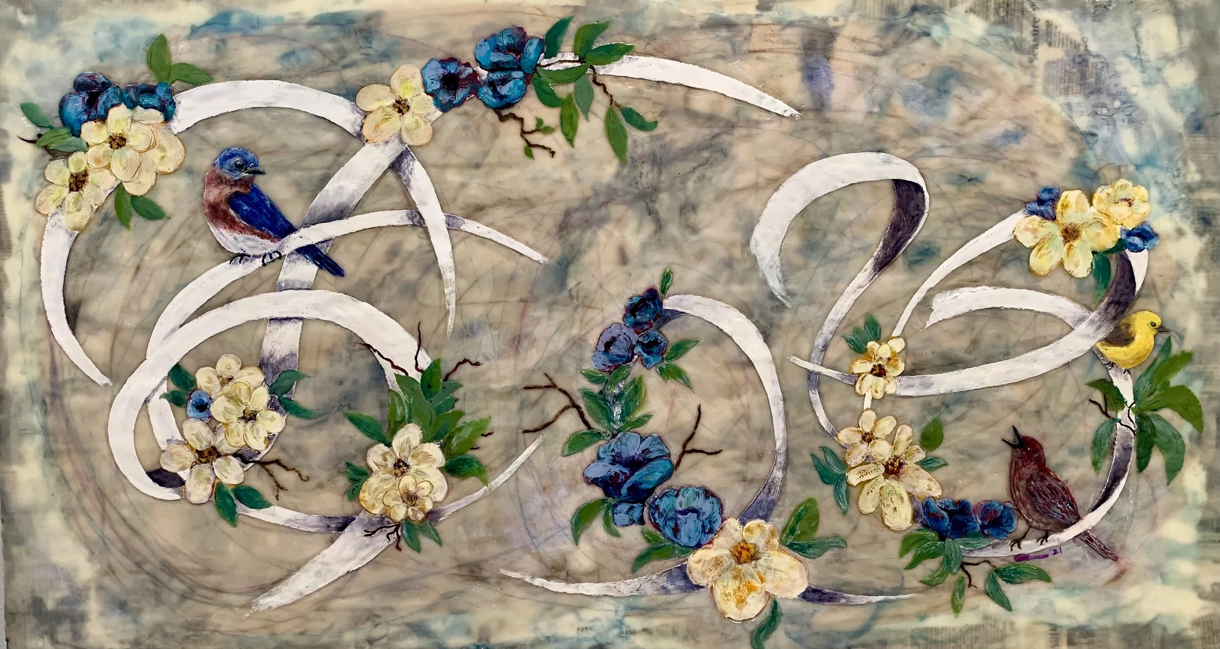 I created this lamp during a Beginning Welding class with Sal St. Germain at the Morean Arts Center in St. Petersburg FL. The base is welded steel and aluminum and the lampshade is encaustic mixed media.